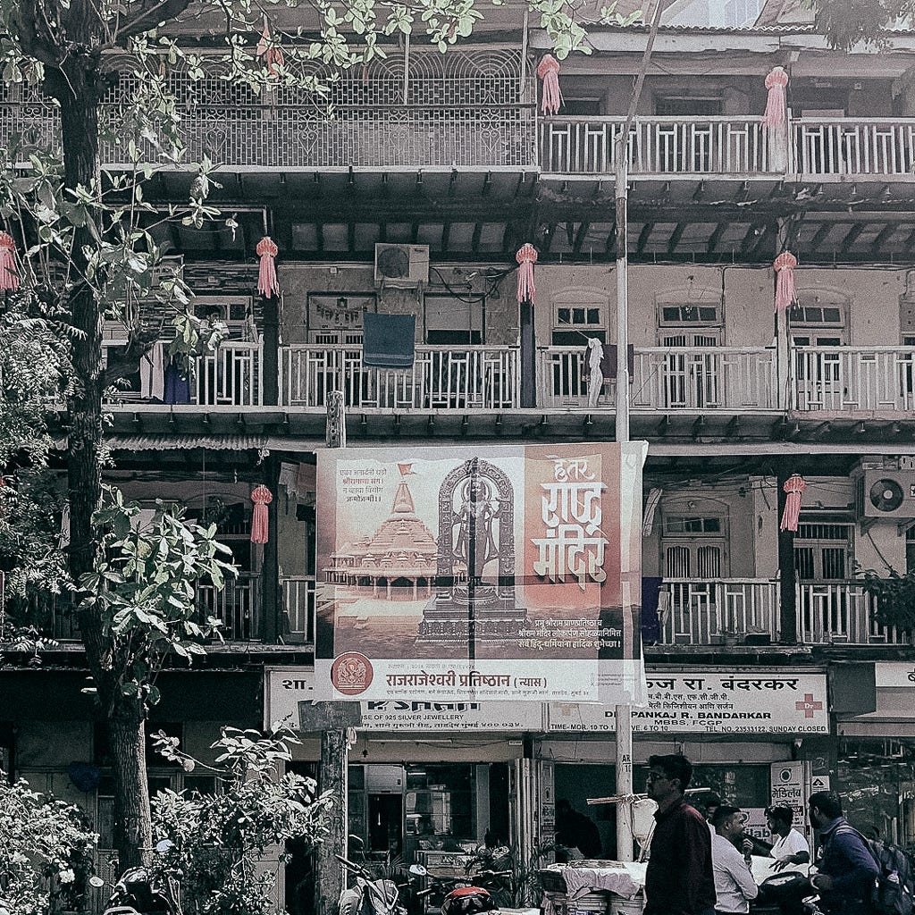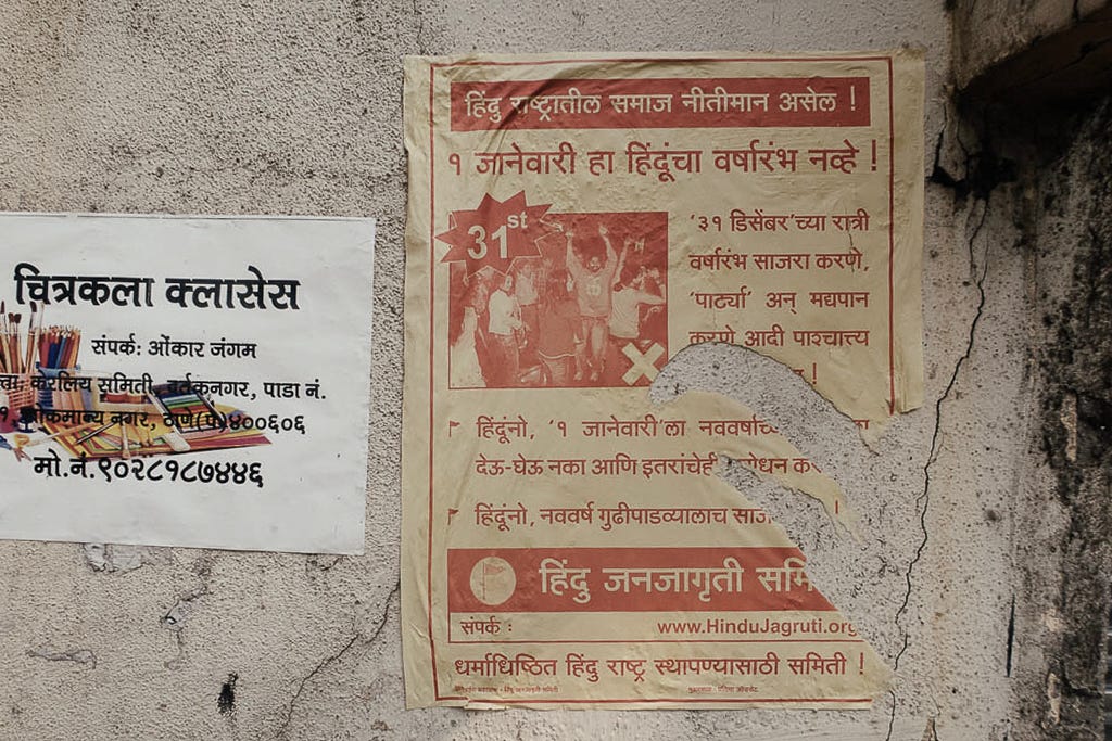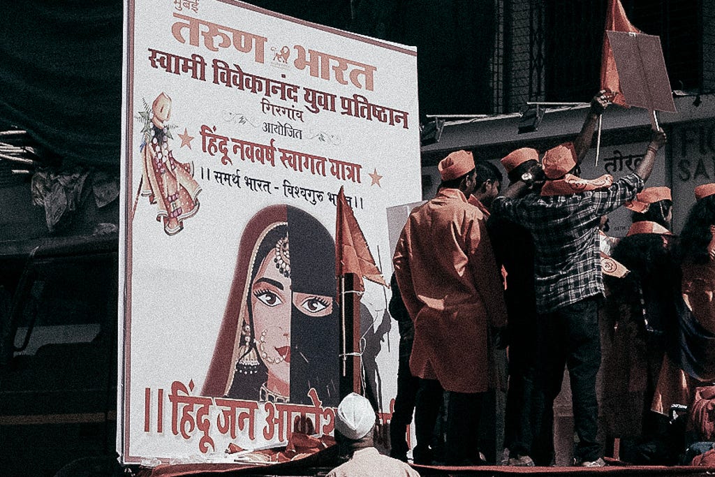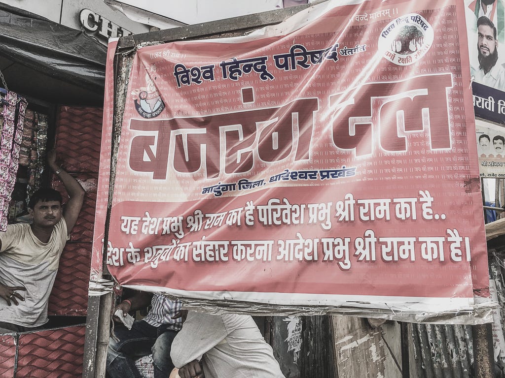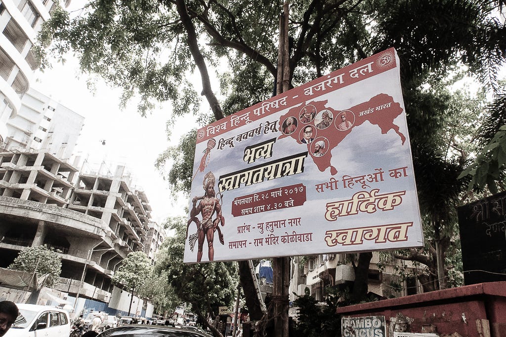 India is officially a secular democracy, and the Hindutva right believes in a Hindu Religious state, which they call the Hindu Rashtra. All Politics is Local. And when one of the affiliates’ male militia organisations of Hindutva likes to mark territory in Mumbai, they use the term Hindu Rashtra.