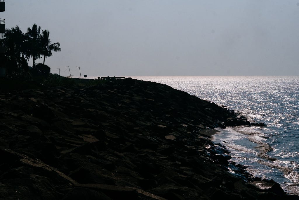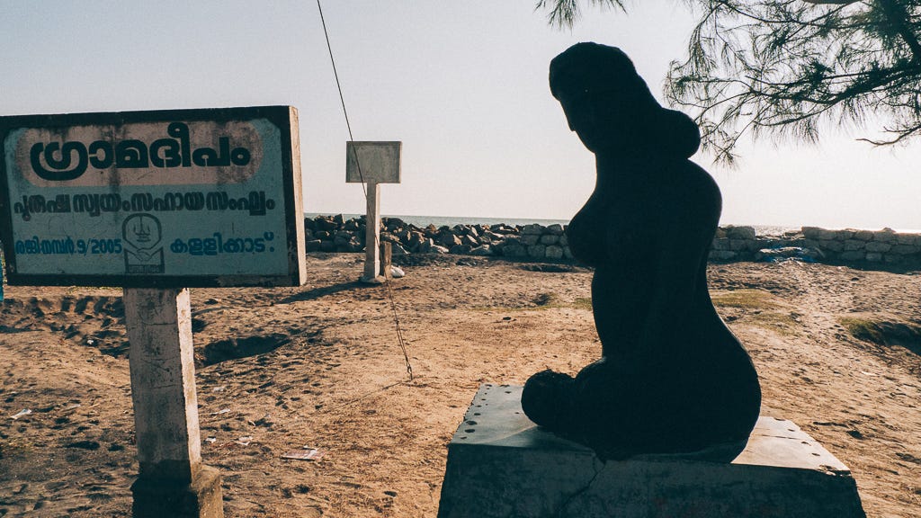 The sculpture above stands as a tribute to the individuals who lost their lives in Kallikad - Arattupuzha village, located in the Alappuzha district of Kerala, on the 26th of December 2004. However, by 2017, the sea had engulfed the area, including the wall visible in the background.