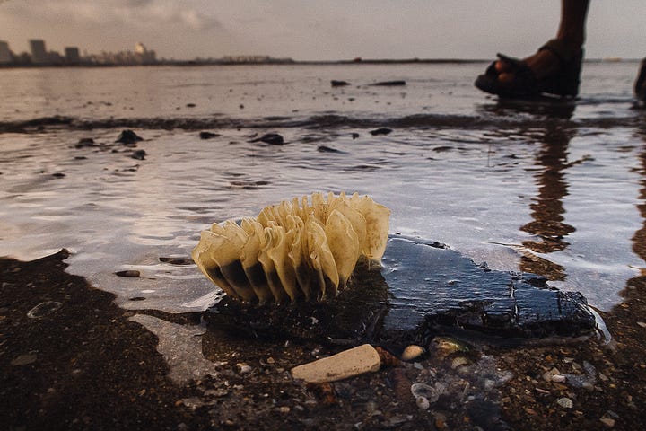In 2017, I went for a walk in the intertidal zone to watch bivalves and other wonders of the intertidal zone, organised by a group called The Marine Life of Mumbai (MLOM), led by Pradip Patade. The place was Girgaon Chowpatty, a narrow strip of sand where Mumbaikars go to experience the sea and mostly to eat. It felt like the most unlikely place to find interesting life, considering the amount of pollution and the number of feet trampling the sand here daily.