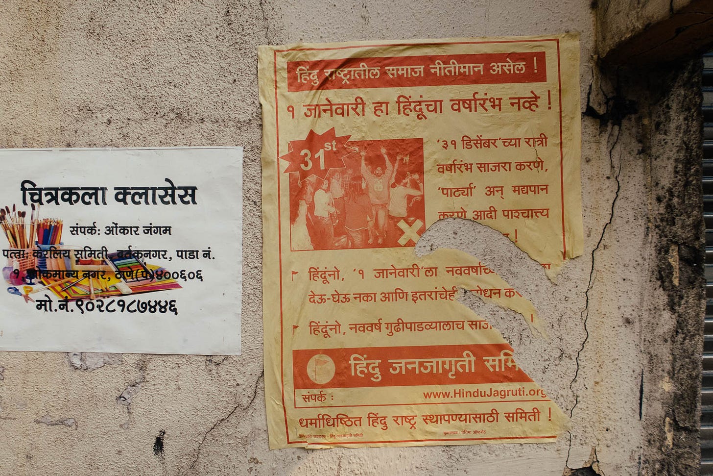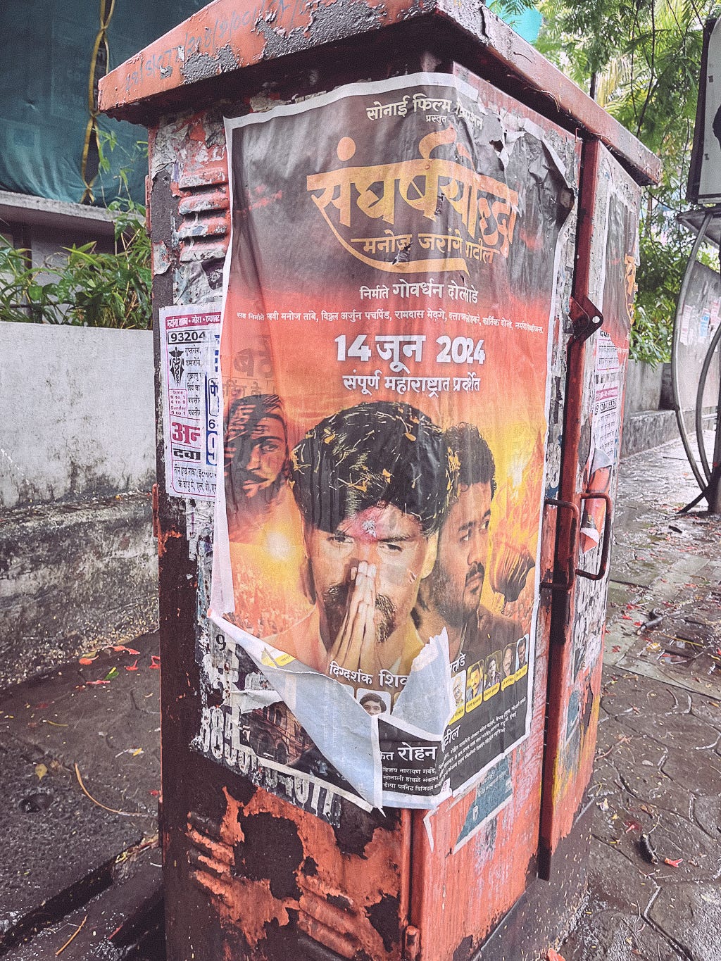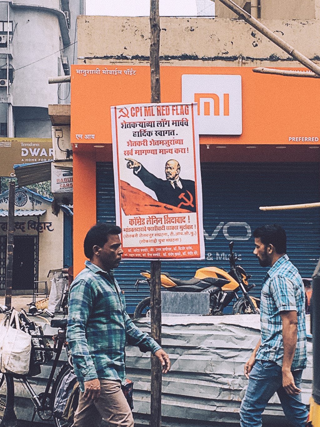 This poster says "Farmer’s Long March" (it happened from Palghar to Mumbai and was organised by the CPI -Marxist Leninist). It was posted on a high-footfall pedestrian path in Ghatkopar East, outside the railway station.